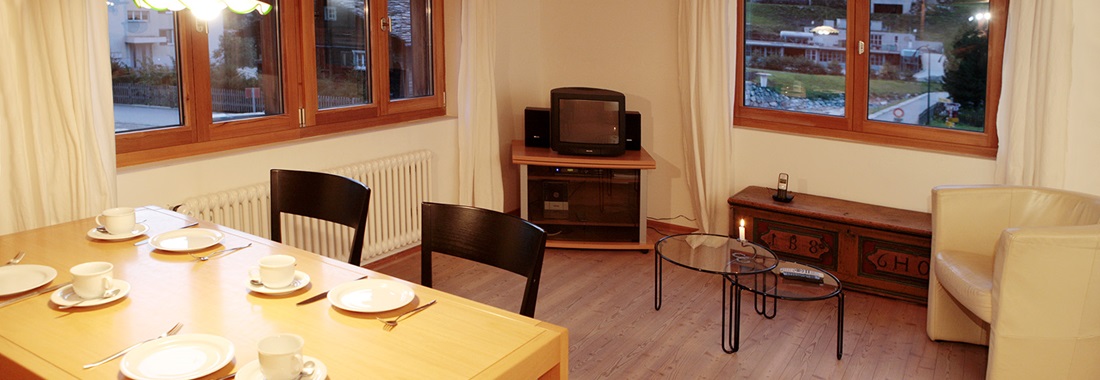 In der 2.5 Zimmer-Ferienwohnung mit ihren rund 65qm ist der Charme des alten Walserhauses spürbar. In der ersten Etage südwärts ausgerichtet befindet sich vor der Etagentür die Garderobe, Sie treten anschliessend direkt in die Stube/Esszimmer ein. Die Küche mit Chromstahl-Elementen ist gut ausgestattet und im Schafzimmer gibt es ein Doppelbett und eine Schlafcouch. Von hier aus geht es auf den Balkon mit einem kleinen Tisch und Stühlen. Das Badezimmer verfügt über eine Badewanne/Dusche. In den Räumen sind die alten Holz-Strickwände sichtbar, der Durchgang von der Stube zur Küche ist gar in seiner alten Form belassen worden. Alte Strukturen, gepaart mit modernen Elementen, machen das besondere Flair der hellen, freundlichen Ferienwohnung aus.